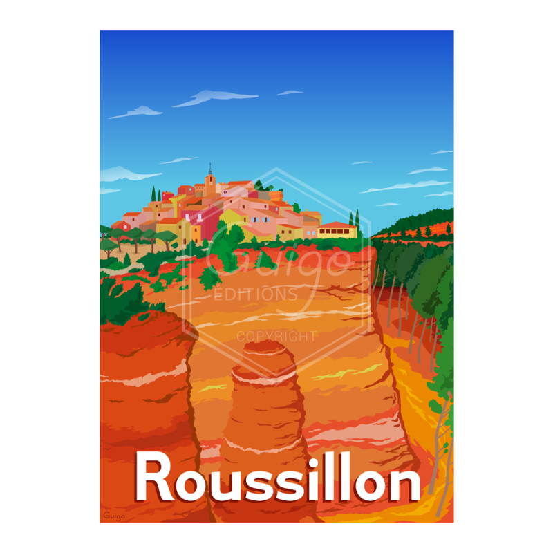 Carte Postale illustrée de Roussillon et ses teintes éclatantes d'ocres. Découvrez nos cartes postales uniques: le cadeau parfait pour toutes les occasions! Toutes les illustrations sont dessinées par l'artiste Guigo.