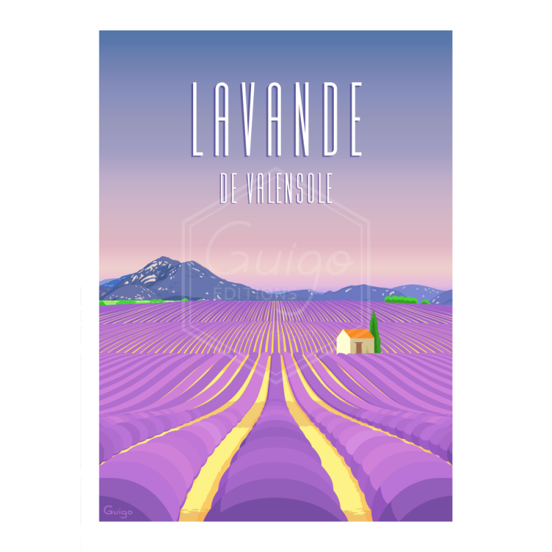 Affiche illustrée des Lavandes de Valensole et son plateau coloré. Découvrez nos affiches uniques : le cadeau parfait pour toutes les occasions ! Toutes les illustrations sont dessinées par l'artiste Guigo.